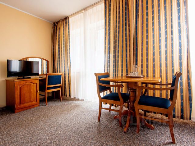 Это одна из комнат трехкомнатных апартаментов, которые находятся на 2 этаже, главного корпуса, и состоят из 3 раздельных комнат, большого холла-гостиной, ванной комнаты и дополнительного санузла.
