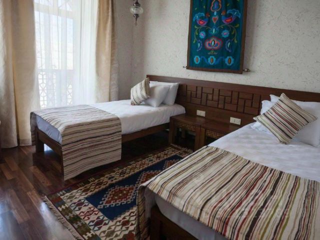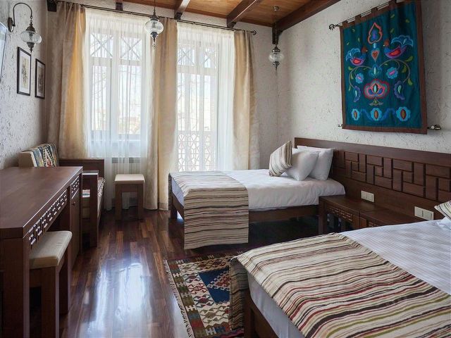 Отель Джеваль расположен в г. Евпатория.Расположившись в сердце Старого города на исторической площади Одун-базар, в 5 минутах от моря, отель стал яркой гранью культурно-этнографического центра, включающего также музей крепостных ворот , кофейню и этно-ресторан.Расстояние до аэропорта составляет- 57 км., а до железнодорожного вокзала-2.2 км. В распоряжении гостей 19 номеров категории Стандарт, тематические люкс "Нар","Зейтун" и апартаменты "Бадем".Номера располагают кондиционером, мини-баром и чайно-кофейной станцией. В собственной душевой комнате предоставляются фен и халат. Из окон люксовых номеров открывается вид на море. В числе прочих удобств - сейф. В отделке номеров отеля использованы только натуральные материалы (черепица-татарка, мебель из крымской акации и черешни). К услугам гостей парковка, ресторан, возможность организовать трансфер. Гостям предоставляется доступ к сети Wi-Fi.По утрам подают завтраки двух видов:крымскотатарский и европейский,которые ежедневно меняются. Работает круглосуточная стойка регистрации. Вежливый персонал отеля любезно посоветует маршрут для Вашего путешествия. В летний период гостям предоставляется бесплатный трансфер на пляж "Лазурный берег".В осенне -зимний период при предварительном бронировании (за 2 недели)возможно посещение бани с купелью на берегу моря. Прекрасный и просторный номер площадью 18 кв.м. хорошо освещен и оформлен в восточном стиле. В номере имеются: 2-х спальная кровать, или 2 односпальных, на выбор Раскладное кресло-кровать Возможность установки детской кроватки LCD- телевизор Посуда Сейф Электрочайник Кондиционер Мини-бар Wi-Fi