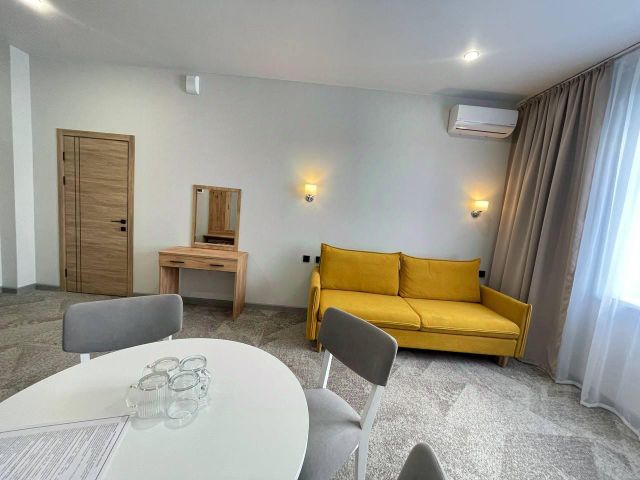 Номер трехместный с холлом, в котором находится зона отдыха (диван, стол, кресла, холодильник). В номере санузел, душевая кабина, кровати, шкаф, тумбочки, комод, спутниковое телевидение, кондиционер (сплит-система), WiFi. Большой балкон с зоной отдыха и видом на море.