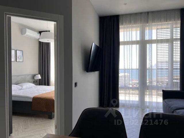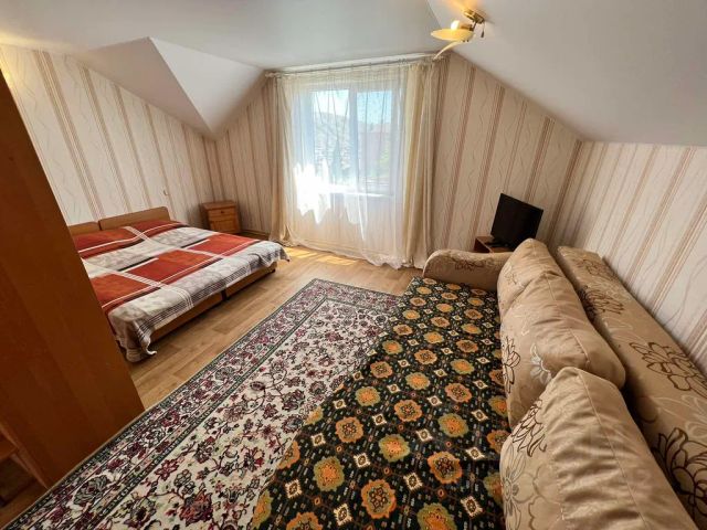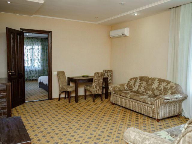 В комнате 2 двуспальные кровати, кожаная мягкая мебель с раскладным диваном, кондиционер, два шкафа/гардероба с зеркалами, трюмо с зеркалом, пуфик, большой холодильник, телевизор, выход на лоджию с видом на море, горы и Генуэзскую крепость.