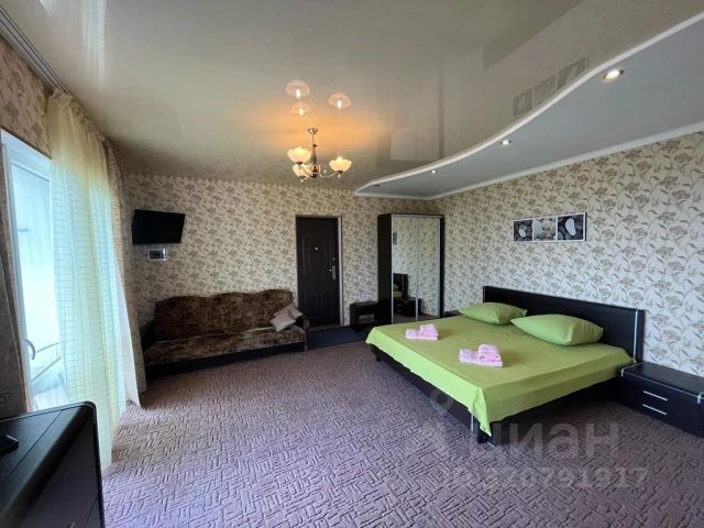 Диван-кровать 1,402,00 с ортопедическим матрацем, прикроватная тумбочка, настенная вешалка с тремпелями, шкаф для одежды и белья, телевизор, кондиционер, столик в виде барной стойки и такие же два стула. В кухонной зоне находится верхний и нижний кухонный модуль, мойка с тумбой, холодильник, посуда, столовые приборы, электрочайник.