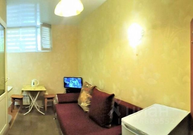 Широкая, большая комната, в комнате есть два раскладных кресла, раскладной диван, 2 тумбочки, стенка горка, вместительный шкаф, 2-й балкон застеклён.