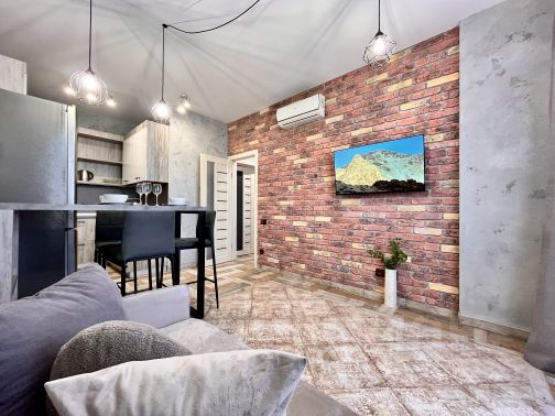 Апартаменты оборудованы всем необходимым для комфортного отдыха: мебелью (диван-кровать, комод, шкаф-купе, кухня, обеденный стол, стулья), техникой (кондиционер, телевизор (Smart TV), холодильник, электрический чайник, электрическая варочная панель для приготовления пищи, стиральная машина, вытяжка, фен, ручной отпариватель для одежды), доступом к интернету (Wi-Fi) и своей ванной комнатой. В наличии - посуда и столовые приборы, а также набор полотенец, постельное бельё, подушки, одеяла (входит в стоимость проживания).