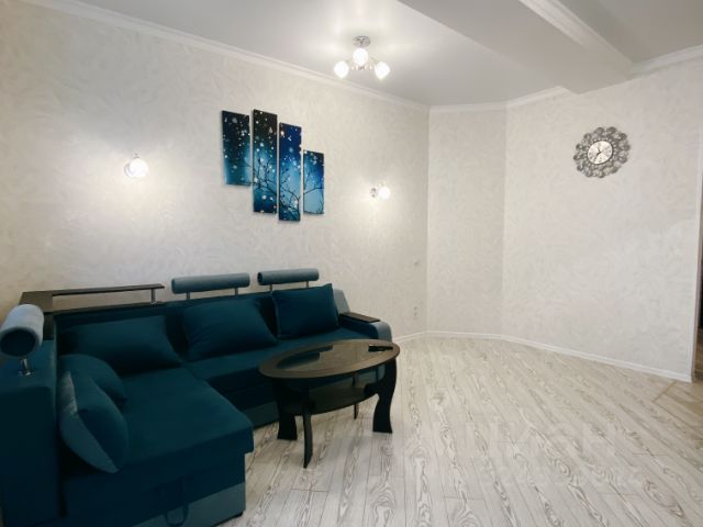 В гостиной - большой белый мягкий диван MOON с антивандальной обивкой из микровелюра. Раскладывается в спальное место 150*210. Большой деревянный обеденный стол SKDESIGN 150*75 см на 6 человек, сплит-система.