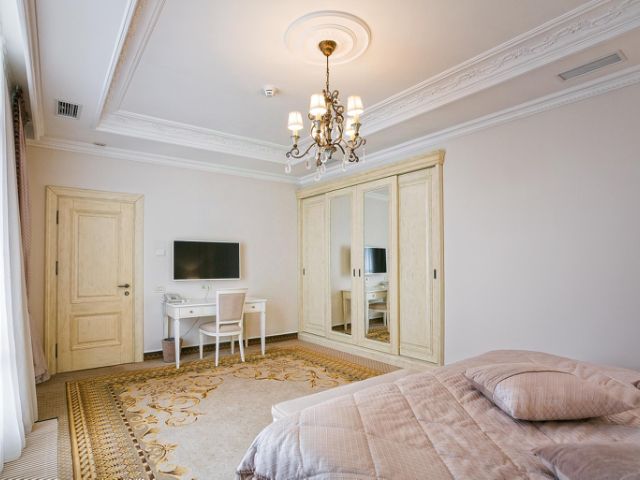 Спальня: двуспальная кровать с ортопедическим матрасом, телевизор, мебель для личных вещей.