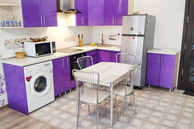 Кухня - плита , микроволновая печь , холодильник , чайник , красивая посуда , ...