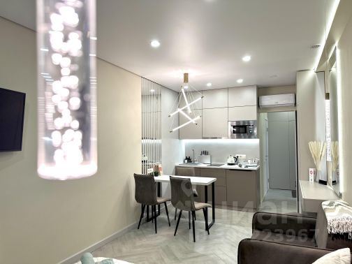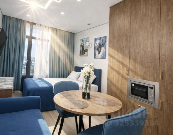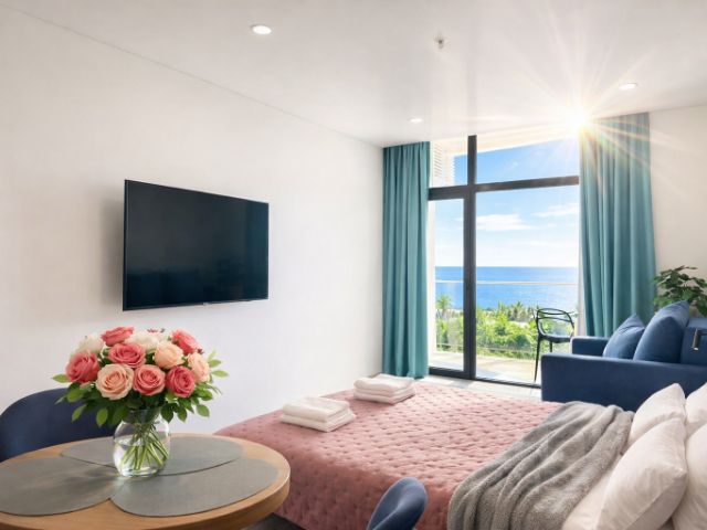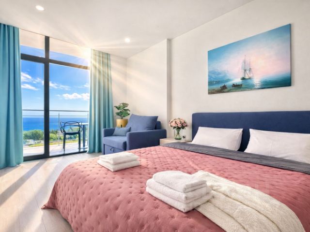 33 м2, дизайнерская студия с боковым видом на море и горы с верхних этажей Жилого комплекса Крымская резиденция в г. Алуште Дизайн апартамента выполнен в соответствии с последними тенденциями в области дизайна и технического оснащения. Уютный, в сочных оттенках апартамент выполнен в стильной контрастной цветовой гамме, отражающей эмоции летних дней, проведенных в нашем курортном городке. Кухонная зона, оборудованная встроенной техникой, плавно перетекает в зону отдыха, разделением которой служит компактный обеденный стол, с подсветкой, создающей уютную обстановку и романтическое настроение. В центре помещения стоит двуспальная кровать, размещенная близ панорамных окон, с видом на яркие вечнозеленые растения. Недалеко расположен гардероб, прихожая, большое зеркало. Для вашего большего комфорта в углу комнаты имеется также консольный столик с зеркалом, служащий туалетным столиком либо, выполняющий функцию рабочей зоны. Смарт ТВ, с диагональю 55 дюймов на телескопическом кронштейне позволит окунуться в виртуальный мир из любого уголка студии, зайти в свой профиль и наслаждаться музыкой из плейлиста. Уединенный санузел с душевой кабиной, с тропическим душем и вертикальной подсветкой расположен ближе к выходу. В апартаментах сервис-центра УК Стиль жизни вы получите максимум удобства, а также полный спектр гостиничных услуг. Наши сотрудники доставят в апартамент свежие продукты, завтраки, подготовят апартаменты к романтическому вечеру Проверяйте доступность апартаментов и бронируйте онлайн, оплачивайте картой или другим удобным для вас способом. Мы рады каждому нашему клиенту и всегда готовы оказать помощь в организации необходимых услуг - Фотосъемка - Экскурсии - Отдых в самых лучших заведениях Алушты Мы ждем вас