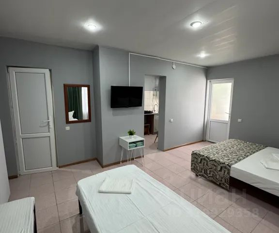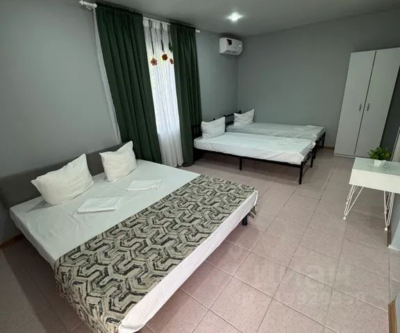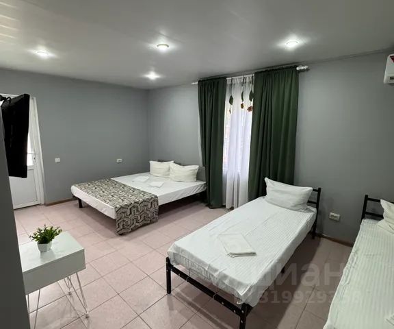 Сдаются апартаменты на втором этаже в частном доме площадью 100 м2, вход в апартаменты изолированный, для данных апартаментов доступна открытая терраса-крыша (100 м2) с видом на море, оборудованная шезлонгами и необходимой мебелью для принятия пищи на свежем воздухе. В апартаментах две спальни, два санузла, просторная гостиная-кухня, а также всё необходимое для комфортного проживания семьи из 5-6 человек: стиральная машина, микроволновая печь, набор посуды, постельное бельё, полотенца, телевизор, кондиционер в гостиной, интернет. В спальнях: 1 двуспальная кровать, 1 раскладное кресло, 2 дивана-книжки, в гостиной 1 диван-книжка. Около дома имеется собственная крытая парковка. Расстояние до моря 200 м, до залива с морской водой 25 м, дом находится на Южной косе в кооперативе "Нептун". Поселок Мирный в 1,5 км, где имеется колхозный рынок, много магазинов, на территории кооператива также достаточно развитая инфраструктура, есть супермаркет, небольшой рынок, сувенирные лавки, а также много кафе, ресторанов, есть детские площадки.