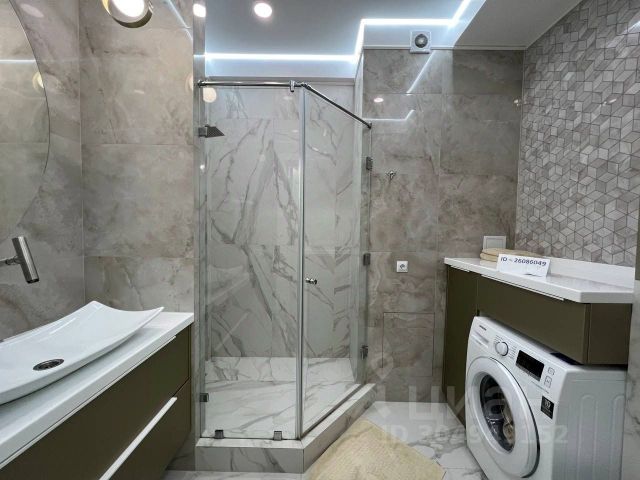 В ванной комнате просторная душевая кабина, раковина с тумбой для принадлежностей, столик для принадлежностей, фен, стиральная машина, большое зеркало с подсветкой. Есть утюг, гладильная доска, сушилка для одежды.