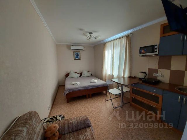 Сдаются стильные апартаменты, оснащены всем необходимым для комфортного проживания двух человек (возможно с ребёнком). Тихое, уютное место, рядом парк (800м), море (900м) магазины, кафе (100м). Двуспальная кровать с чистым постельным бельём, телевизор, wi-fi, встроенный в стену шкаф, шкаф доя обуви, гладильная доска, кухонная зона (плита, микроволновая печь, холодильник, ящички для приборов и посуды, раковина, эл. чайник, вытяжка). В ванной имеется: Душ, фен, стиральная машина, гигиенический душ, полотенца. В студии стеклянные окна в пол, шторы (blackout). Работаем больше трёх лет, все фото подлинные и приехав, вы удивитесь поразительному сходству фотографий с самой студией! Спасибо, что выбираете наше объявление!