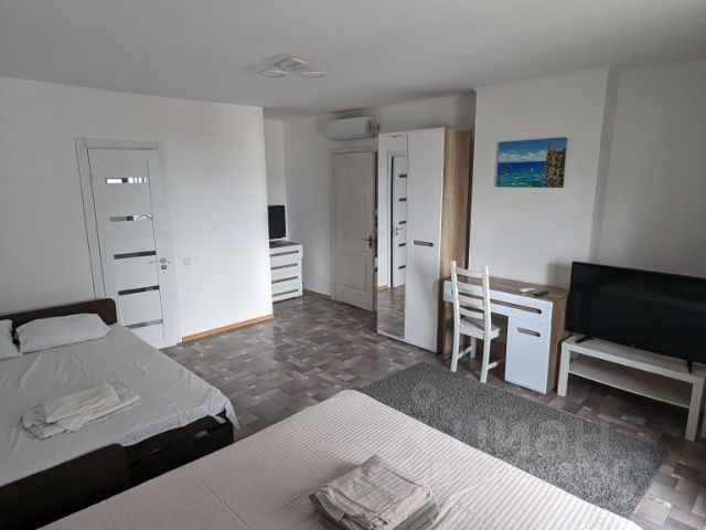 1-я комната: кровать, 3-х местный раскладной диван, платяной шкаф, 2 тумбочки, стол, стул, журнальный столик, TV, кондиционер.
