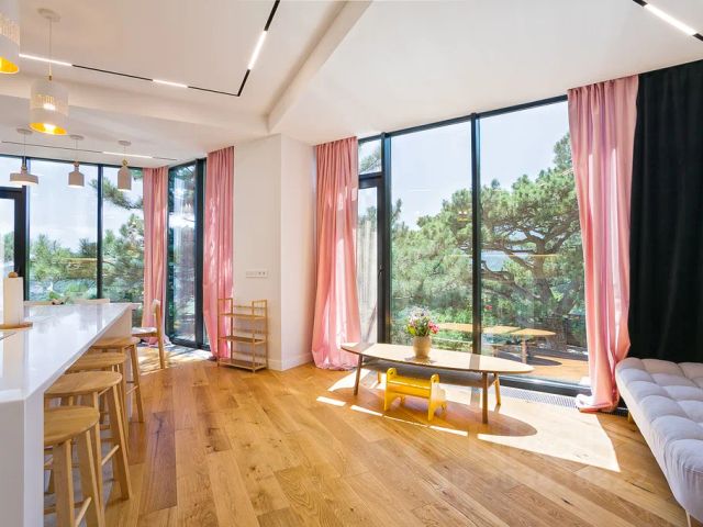 Имеется кухня (оснащение: газовая плита, холодильник, микроволновка, чайник, посуда, горячая/холодная вода) в застекленной беседке с панорамными раздвижными окнами и зоной барбекю, красивой деревянной мебелью, дизайнерским декором, большими качелями; сауна (платно).