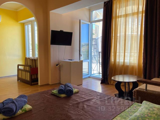 Сдам просторную студию (есть двухкомнатные) в гостевом доме. Все удобства, мебель, горячая/холодная вода, WI-FI, телевизор, холодильник, балкон, панорамный вид на море и горы. Благоустроенная территория: есть стоянка для авто, мангал, детская площадка, детский бассейн, навесы. До пляжа 15 минут пешком. Есть возможность заказать питание или самостоятельного приготовления еды (мини-кухня). Работаем круглогодично. Дополнительно через наших партнеров - экскурсии, санаторное лечение. Стоимость проживания зависит от количества человек в студии и сезона. В межсезонье сдаем студии помесячно. Скидки для организаций, профсоюзов при массовом заезде, организаторам - бонусы. Для оперативного ответа просьба звонить, не писать сообщения.