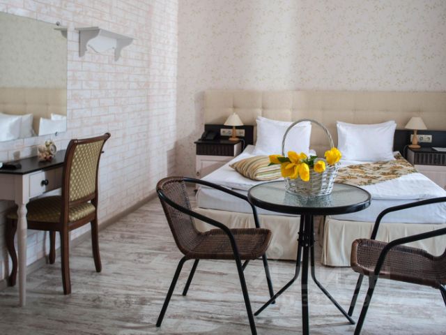 В самом центре курортного города, на берегу черноморского побережья расположился современный отель "Лиана". Здесь вас ожидают комфортабельные и уютные номера и просторные апартаменты.Особенного упоминания заслуживает пляж, находящийся всего в нескольких минутах ходьбы от отеля.На территории отеля расположен ресторан с летней террасой, где можно попробовать изысканные блюда европейской кухни и лучшие вина. В летний период гости могут по достоинству оценить разнообразие шведского стола. А ежедневная анимация для детей и взрослых не оставляет ни единого шанса на скуку! Отдых в Евпатории незабываемое приключение на побережье Черного моря.Термальные источники и минеральные воды, целебные грязи и рапа, уникальное сочетание ионизированного морского и степного воздуха, благоухающего ароматами лечебных трав, делают отдых на крымском полуострове не только приятным, но и полезным.Проводить время на курорте можно по-разному: в Старом городе есть большое количество интересных мест, достопримечательностей, памятников культуры и музеев, можно отправиться на морскую прогулку на теплоходе, посетить многочисленные кафе, рестораны и клубы или просто приятно провести время под ласковым солнышком на благоустроенных золотистых пляжах. Номера категории стандарт двухкомнатный прекрасно подходят для отдыха в спокойной и расслабляющей обстановке. Это то, что вам нужно для идеального отдыха.