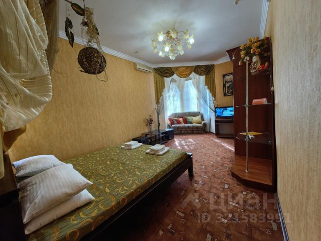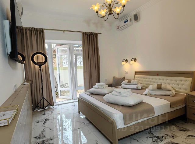 В комнате 2 двуспальные кровати, кожаная мягкая мебель с раскладным диваном, кондиционер, два шкафа/гардероба с зеркалами, трюмо с зеркалом, пуфик, большой холодильник, телевизор, выход на лоджию с видом на море, горы и Генуэзскую крепость.