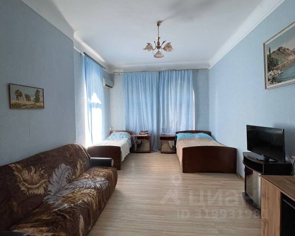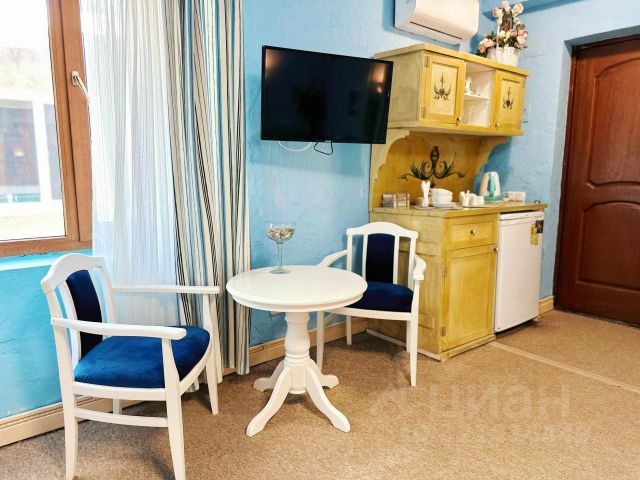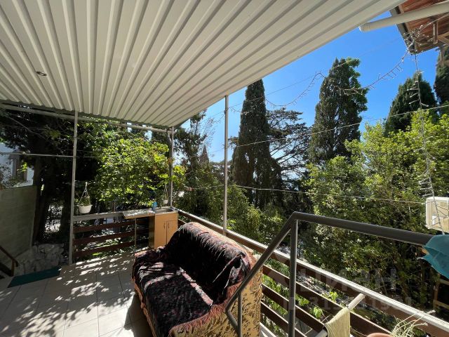 Комната студия расположена на втором этаже, имеется видовая летняя. Терраса вид на море, терраса из дерева обшита деревянной вагонкой из сосны, из комнаты есть вид на гору ай петри, на террасе уютно, столик, кресла из лозы, цветы. Двор отдельный, закрытый, есть мангал.