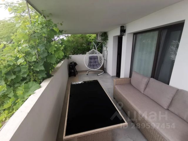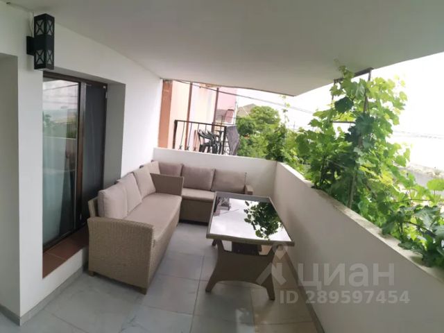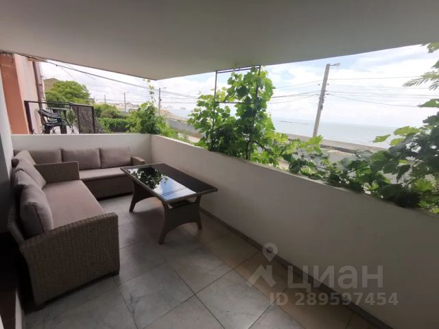 • - балкон с видом на море, оборудованный столом со стульями.