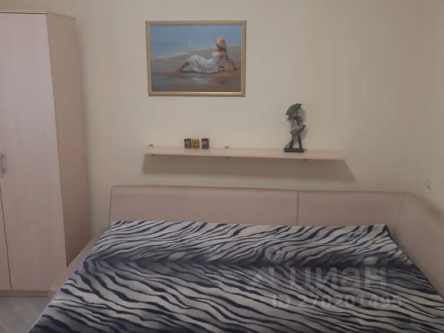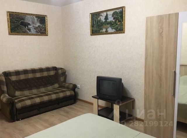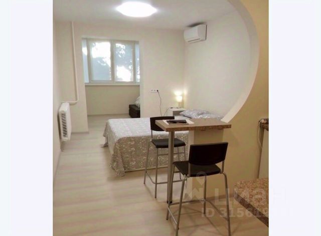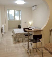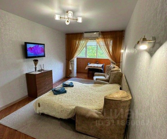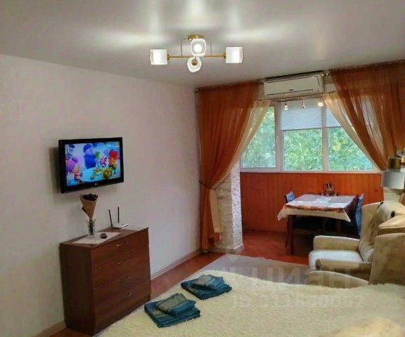 Гостиная: раскладывающийся диван, большой LED телевизор, цифровое ТВ, кондиционер, шкаф, встроенная кухня с техникой, электрическая плита, СВЧ печь, электрический чайник.